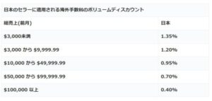 日本のセラーが海外のバイヤーに商品を販売した場合に発生する手数料です。現在の目安は約1.35%で、セラーの売上規模によって割引が適用される場合があります。
